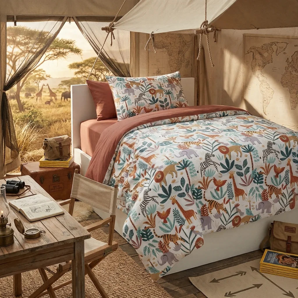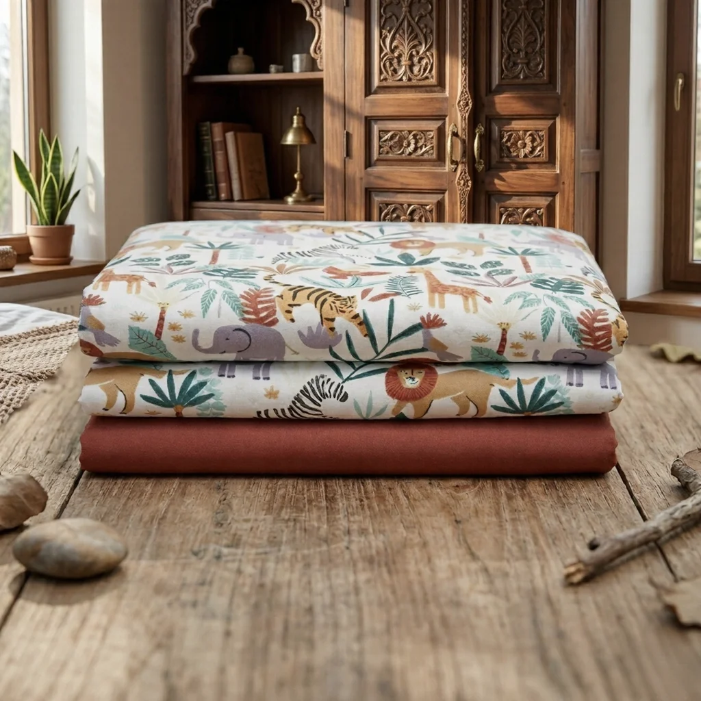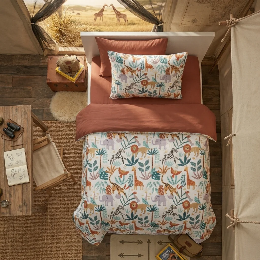 Add a cheerful and adventurous vibe to your bedroom with the Jungle Parade Bedsheet. Inspired by the beauty of the wild, this design features a lively mix of jungle animals and tropical foliage, making it a perfect choice for kids’ rooms or anyone who loves bold and playful décor.
