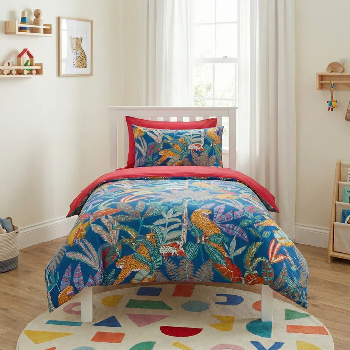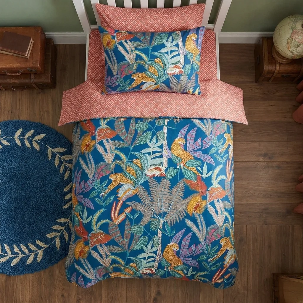 Turn your bedroom into a lively jungle adventure with the Tropical Jaguars Bedsheet Set. Designed with bold jaguar prints and rich tropical elements, this bedding set adds a fun and energetic touch to any space—perfect for kids and themed interiors.