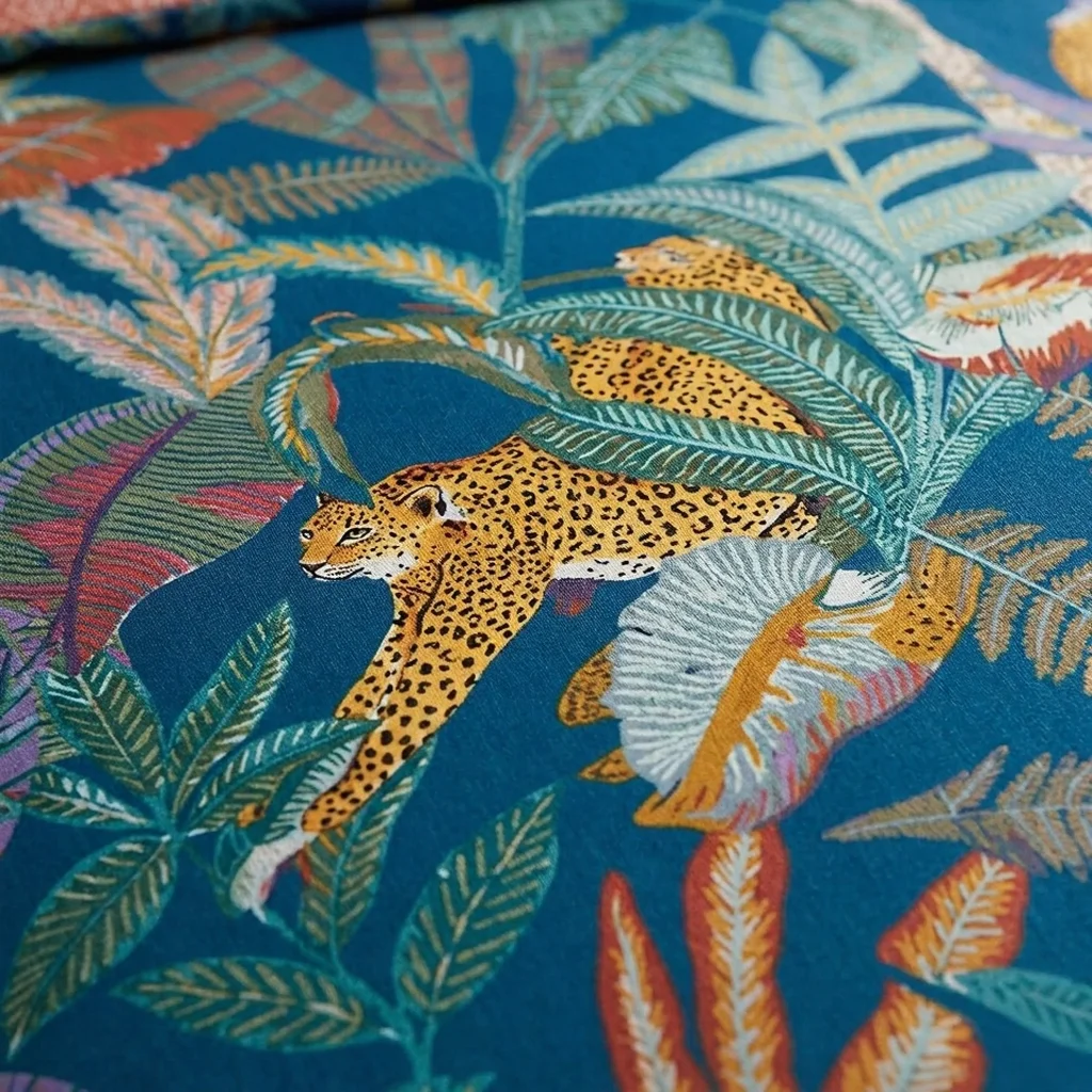 - Tropical jungle design with jaguar and nature-inspired prints